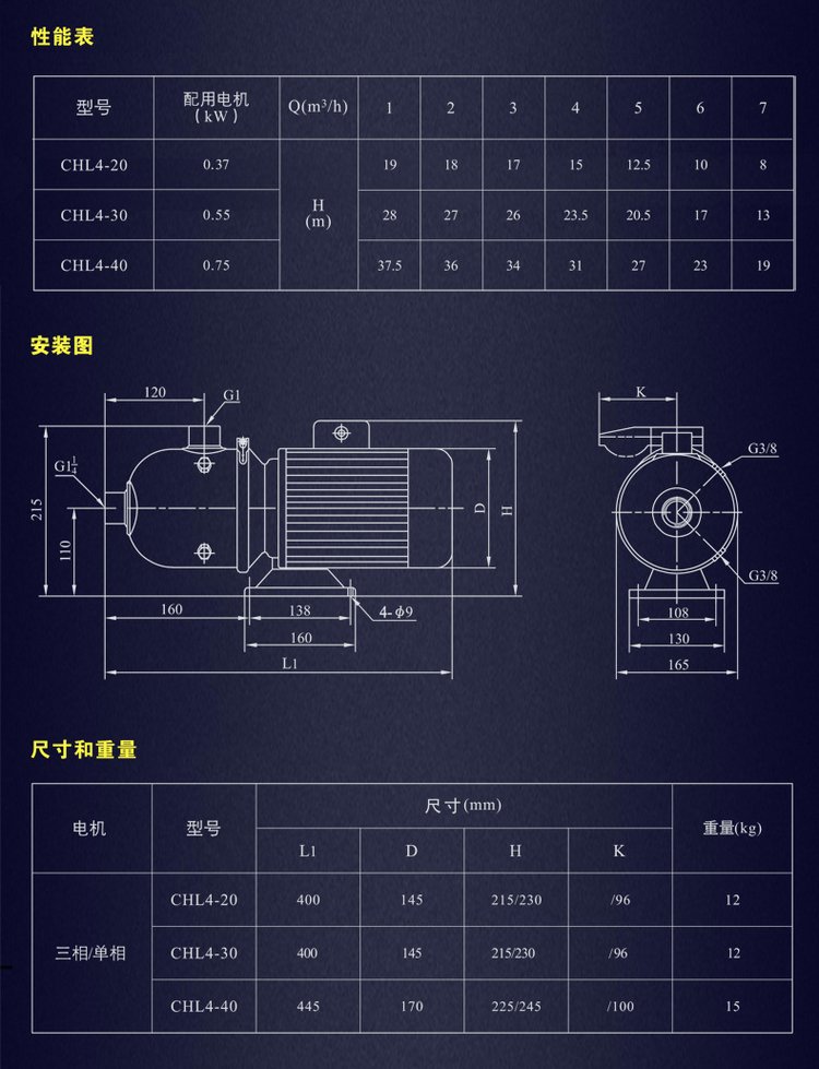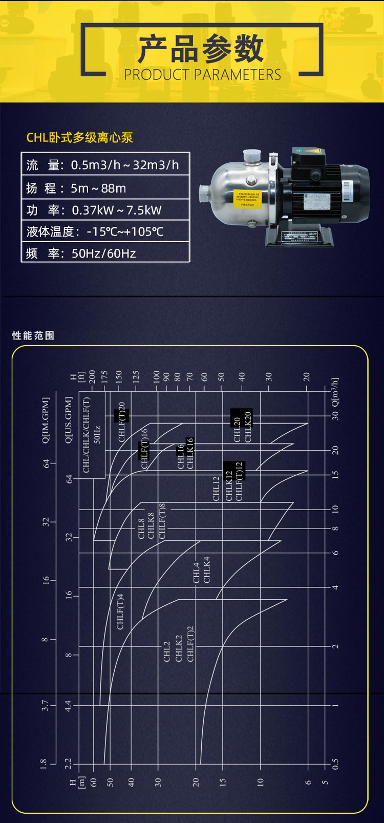 流量(liang)範圍:0.5m³/h~28m³/h 揚程(chéng)範圍:5m~60m
