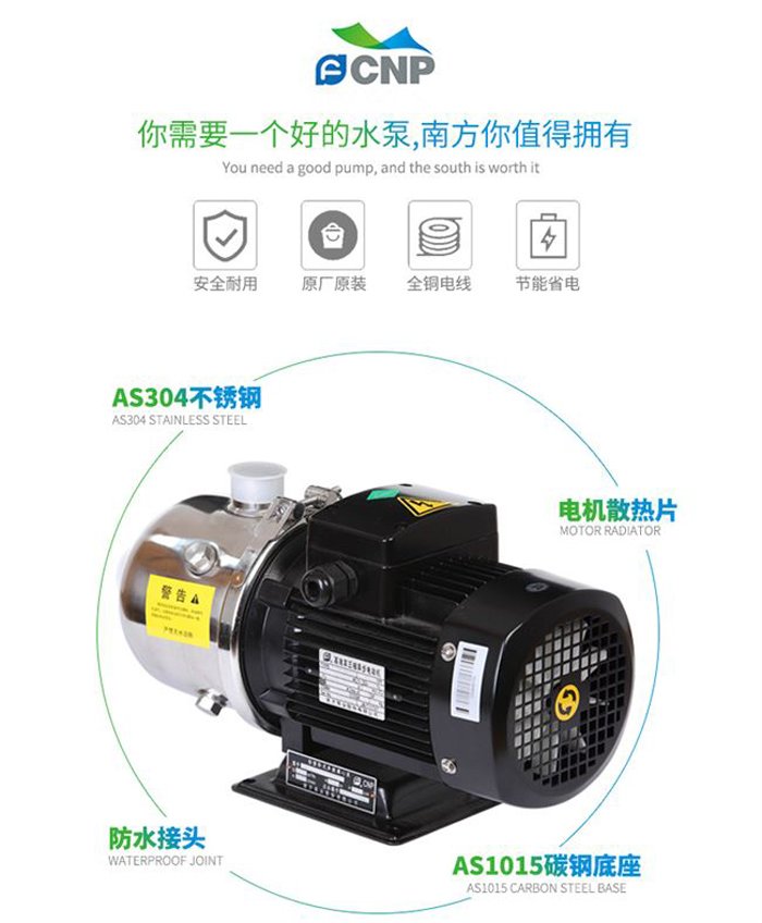 非(fei)自吸卧式(shi)多級離心(xin)泵,葉輪導(dao)葉采用不(bu)鏽鋼闆沖(chòng)壓焊接制(zhi)成